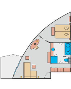 Alle Kabinen und Suiten sind mit einer Klima-Anlage, Teppichboden, Dusche/WC, Sat.-TV, interaktives TV, Informations- und Entertainmentsystem, Radio, Föhn, zusätzliche Kopfkissen und Direktwahltelefon ausgestattet. In allen Suiten befinden sich Duschen und/oder Badewannen. Die Handtücher in den Kabinen und Suiten werden täglich ausgetauscht und am Pool liegen gegen Pfand Pooltücher für die Gäste bereit. Im Wellnessbereich finden die Gäste Bademäntel vor. Die Suite ist mit einem großen Panorama-Fenster, einem Doppelbett und 2 Schlafsesseln ausgestattet.